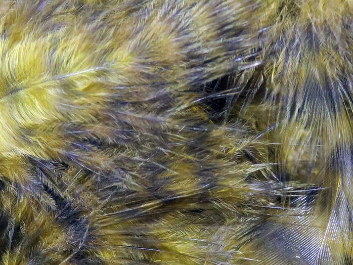 Hareline Grizzly marabou is a short, naturally barred marabou that we use on smoke wagons, silk kitties, sumps, and many other streamer patterns.