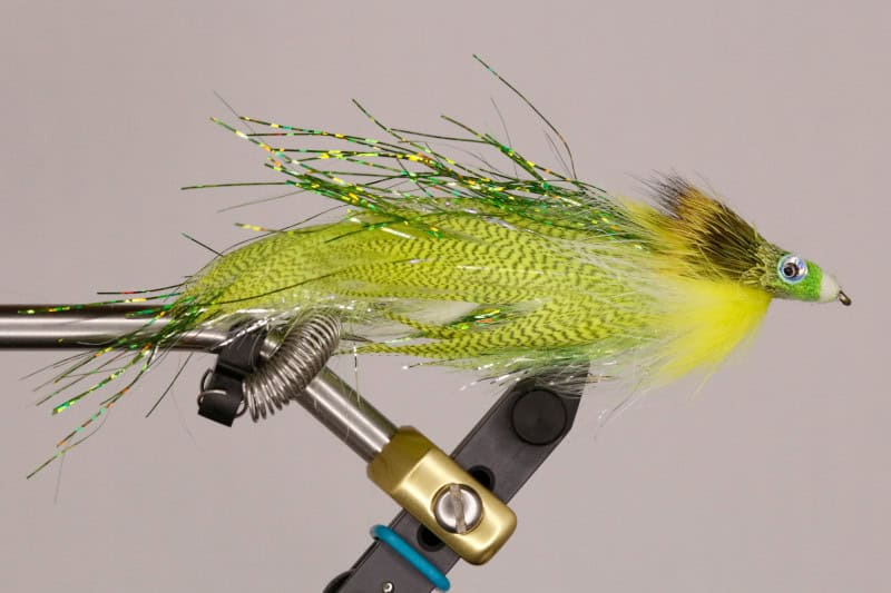 Lynch’s mini drunk and disorderly fly pattern. Tommy lynch’s drunk and disorderly now available in a smaller size. The mini drunk and disorderly is an articulated streamer with tons of flash, and a deer hair head cut at an angle to give the fly a diving or fluttering motion in the water. This pattern is able to achieve an erratic action similar to that of the swimmin jimmy because the head is treated with a  UV resin– Creating a hydrophobic wedge that forces water over the body at different angles each time it is retrieved.