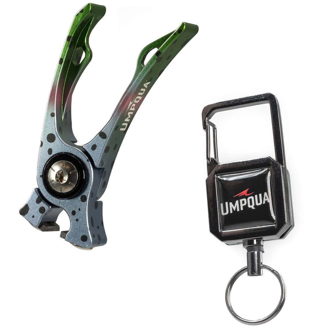 The Umpqua RiverRun Nipper W/ Retractor with the Artist Series Nipper pairs our precision-cutting stainless steel nippers—finished in exclusive Umpqua Rainbow or Brown Trout patterns—with a bombproof aluminum retractor.