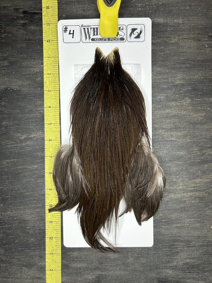Whiting dry fly capes are the ultimate in dry fly tying. With long supple quills and incredible barb density capable of tying down to size 24 and even smaller, Whiting genetic dry fly hackle is the connoisseur’s choice for fly tying. This product line derives its heritage from the legendary Hoffman grizzly super hackle stock. Only Whiting Farms has this incredible genetic stock to offer you.