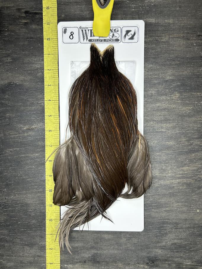 Whiting dry fly capes are the ultimate in dry fly tying. With long supple quills and incredible barb density capable of tying down to size 24 and even smaller, Whiting genetic dry fly hackle is the connoisseur’s choice for fly tying. This product line derives its heritage from the legendary Hoffman grizzly super hackle stock. Only Whiting Farms has this incredible genetic stock to offer you.