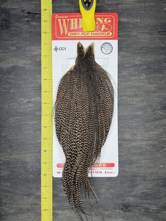 Whiting dry fly capes are the ultimate in dry fly tying. With long supple quills and incredible barb density capable of tying down to size 24 and even smaller, Whiting genetic dry fly hackle is the connoisseur’s choice for fly tying. This product line derives its heritage from the legendary Hoffman grizzly super hackle stock. Only Whiting Farms has this incredible genetic stock to offer you.